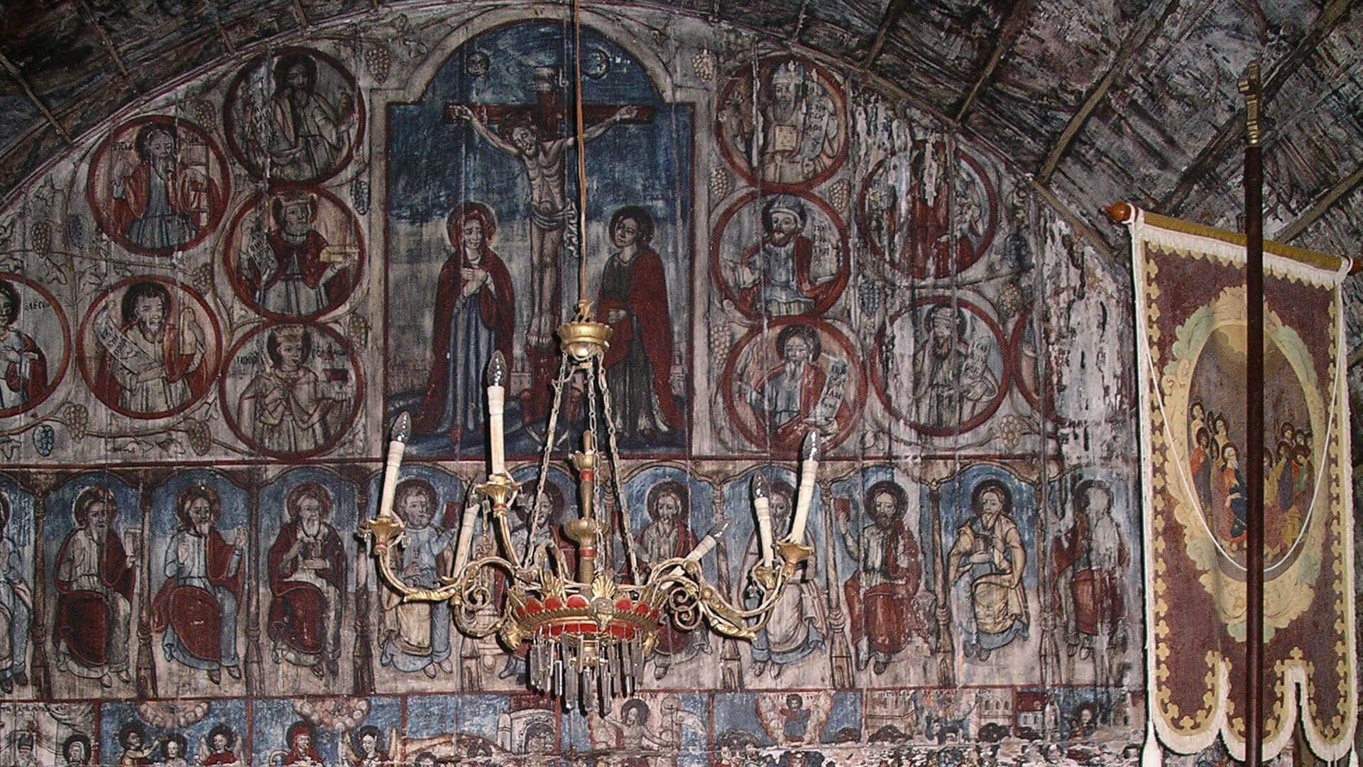 Datorită deteriorării stratului pictural se mai pot vedea câteva scene din Vechiul și Noul Testament (pe pronaos); trei medalioane cu Sfântul Duh, Maica Domnului Orantă și Iisus Atotputernic, medalioane cu sfinți apostoli și prooroci, scene din ciclul christologic (pe naos); Răstignirea lui Iisus, Iisus tronând, sfinții prooroci, sfinți apostoli și evangheliști, cele 12 mari praznice de peste an (pe catapeteasmă); Iisus înconjurat de cei 4 evangheliști (pe tâmpla de vest a naosului); Judecata Raiului (median stânga); Judecata de Apoi (median dreapta); Arhanghelul Mihail încadrat de două scene din Ciclul Patimilor (deasupra ușii).