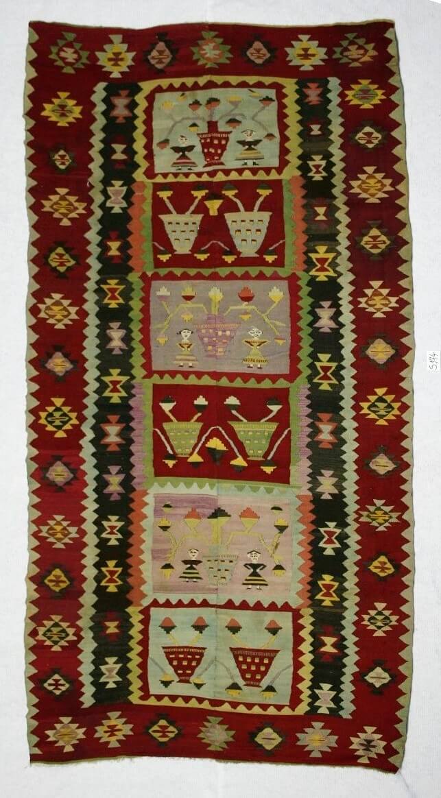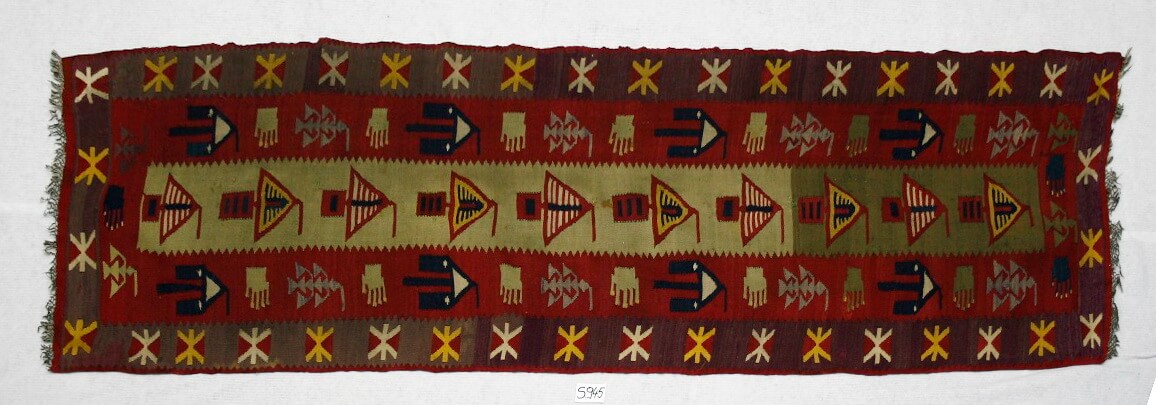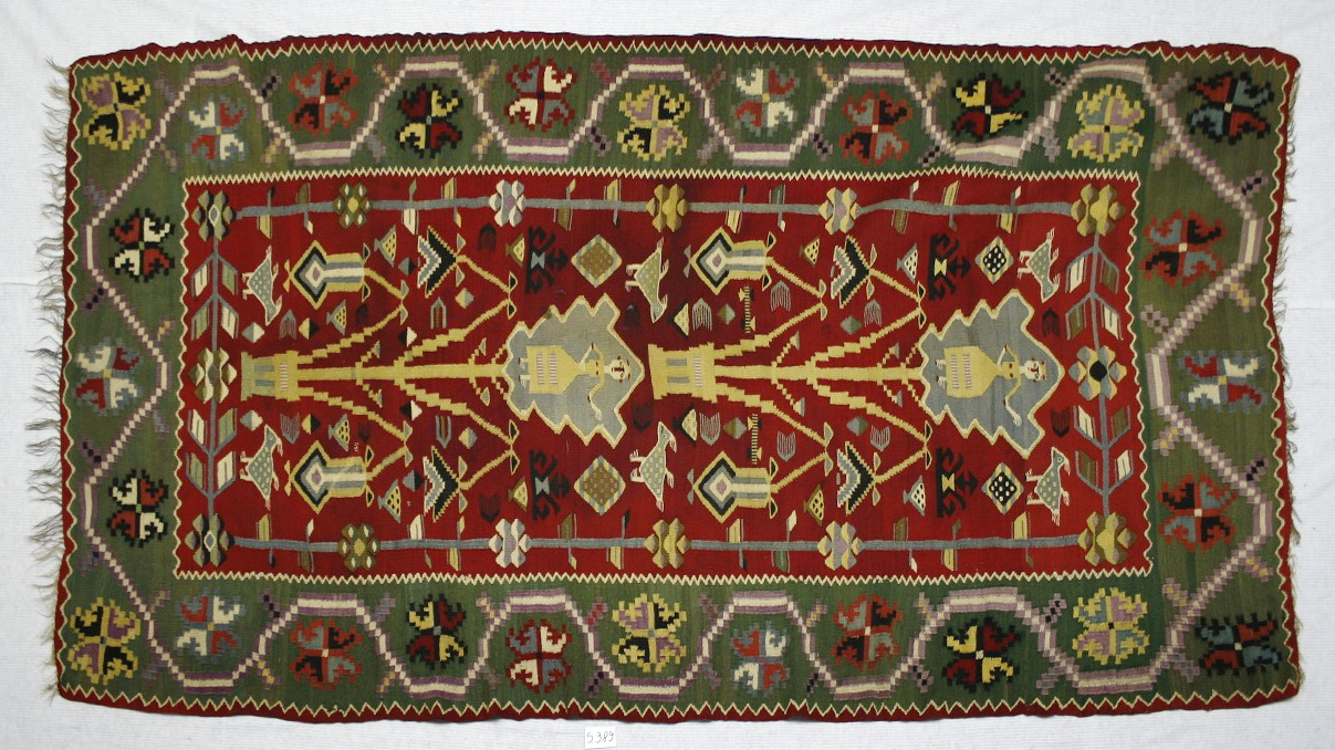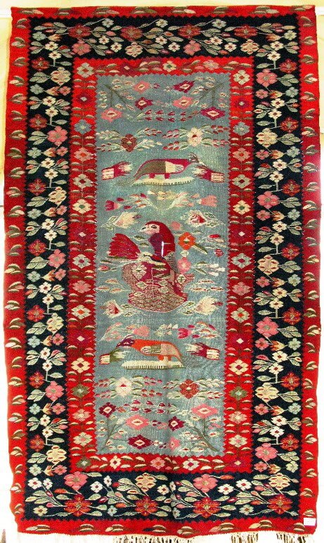 ce are ca motive decorative papagali), animale sau stilizări antropomorfe (personaje feminine – S 972, piesa unică în colecţia muzeului, al cărei decor reprezintă o femeie îmbrăcată într-o rochie roz, strânsă în talie cu o centură verde ale cărei capete atârnă în jos peste rochia largă, iar pe cap o diademă. Scoarţa a participat la Expoziţia Internaţională de la Paris (1900), unde de altfel, a a fost și premiată.