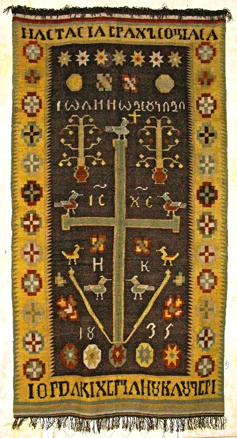 Cea mai veche scoarţă datată, din colecţia muzeului, este piesa oltenească S 868(datată 1789), care, din punct de vedere ornamental, are o compoziţie dominată de motivul vegetal, zoomorf şi antropomorf. În centrul compoziţiei este dispus un vas cu flori, compus asimetric. De o parte şi de alta, în sus şi jos, păsări şi animale se plimbă printre ramuri cu frunze şi flori. La un moment dat, o cămilă trasă de un personaj. Mai sus două fetiţe cu rochiţă largă.