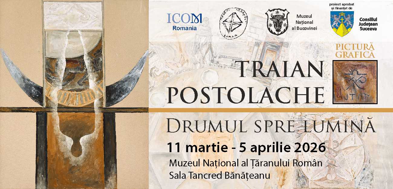 Muzeul Național al Bucovinei, în parteneriat cu Muzeul Național al Țăranului Român, vă așteaptă miercuri, 11 martie 2026, de la ora 17:00, în Sala Tancred Bănățeanu, la vernisajul expoziției Traian Postolache. Drumul spre lumină. Evenimentul se va bucura de prezentarea critică a dr. Marius Tița. Proiectul este finanțat de Consiliul Județean Suceava și se desfășoară sub egida Consiliului Internațional al Muzeelor (ICOM).